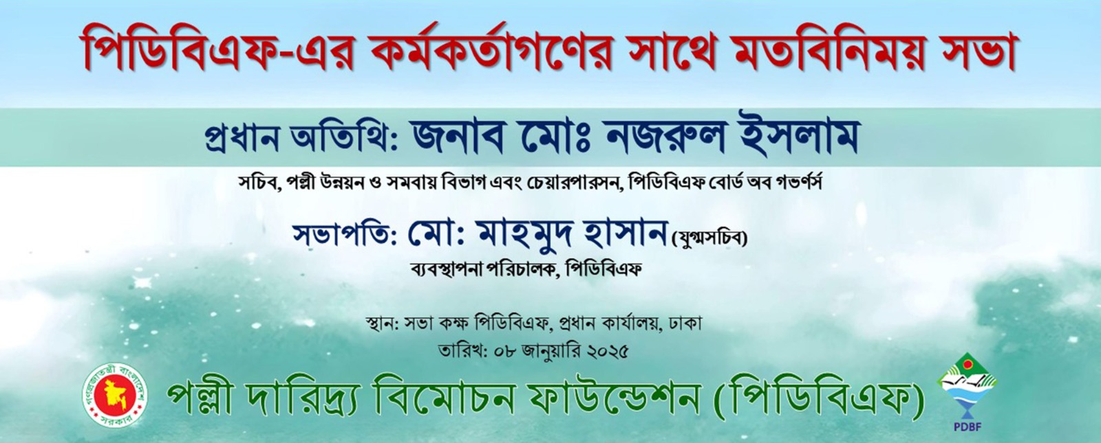 সম্মানিত সচিব মহোদয়ের সাথে পিডিবিএফ-এর কর্মকর্তাগণের মতবিনিময় সভার স্থিরচিত্র।
