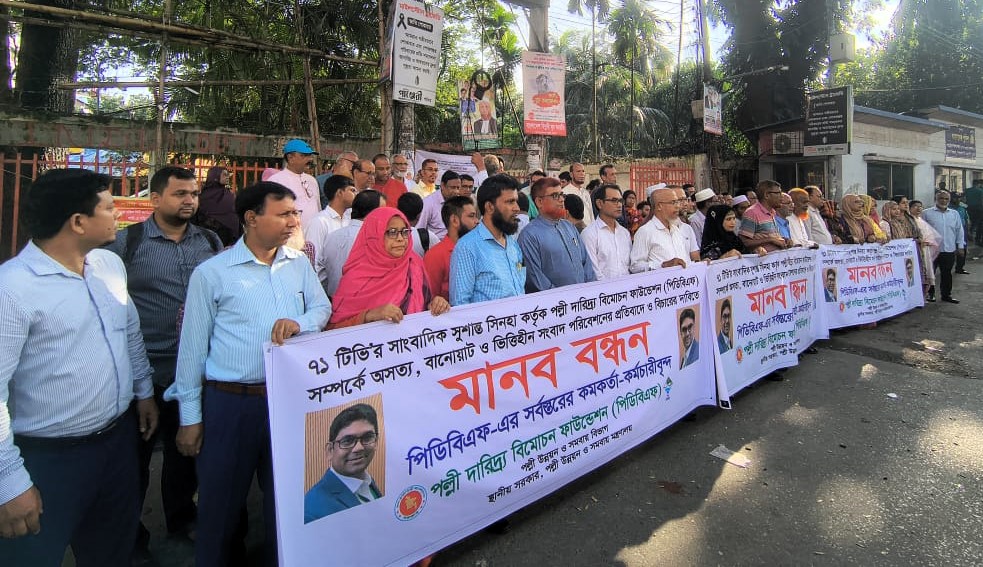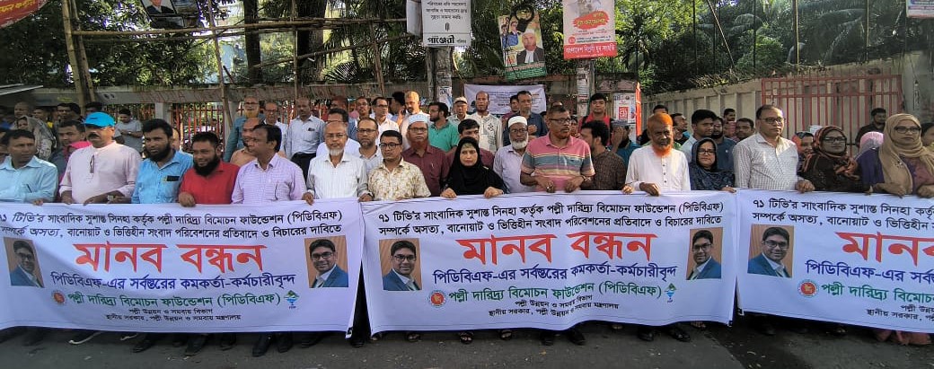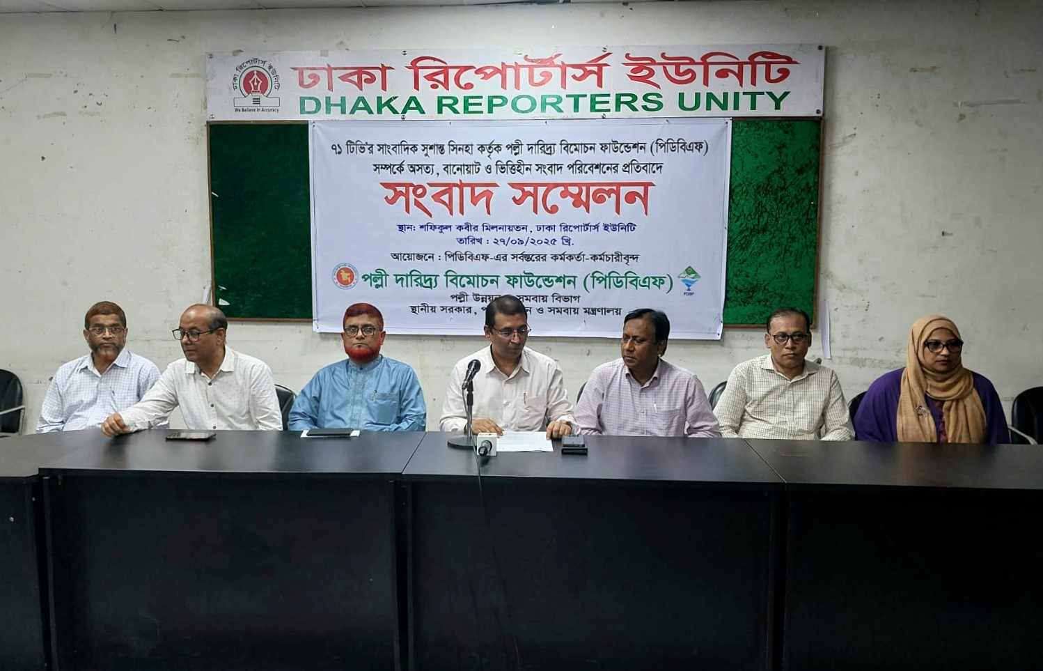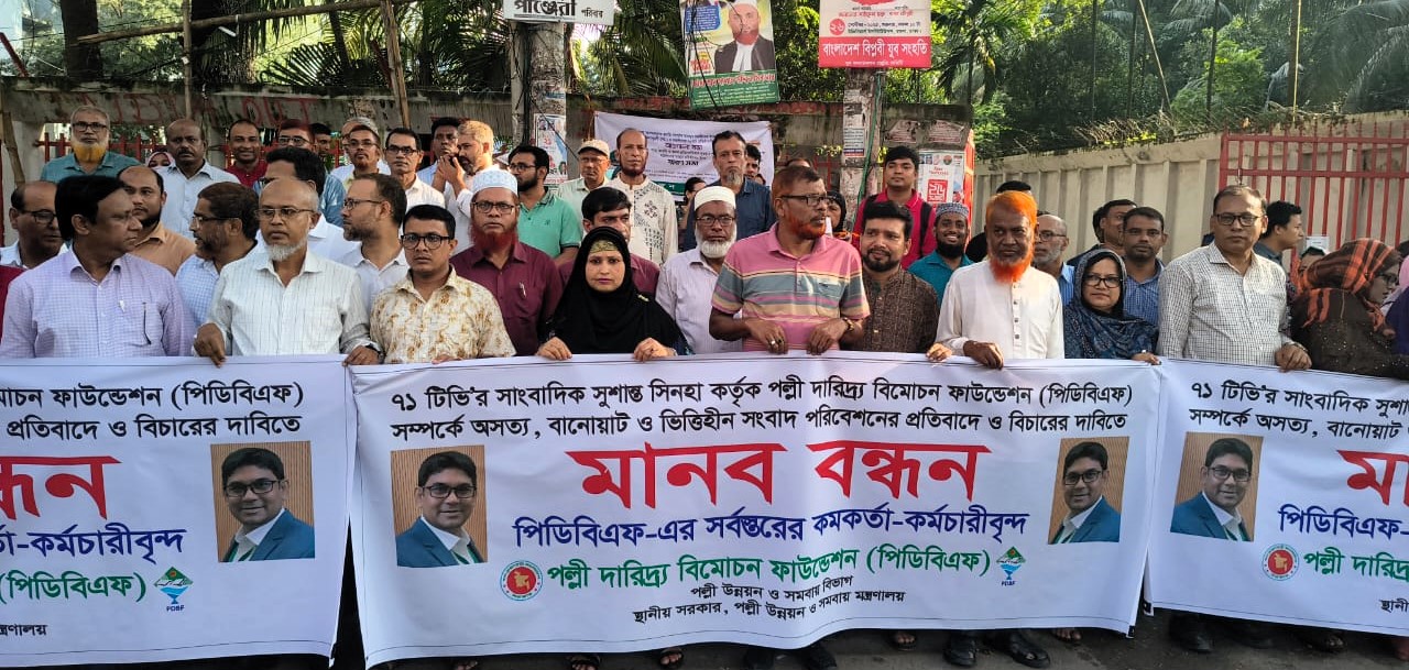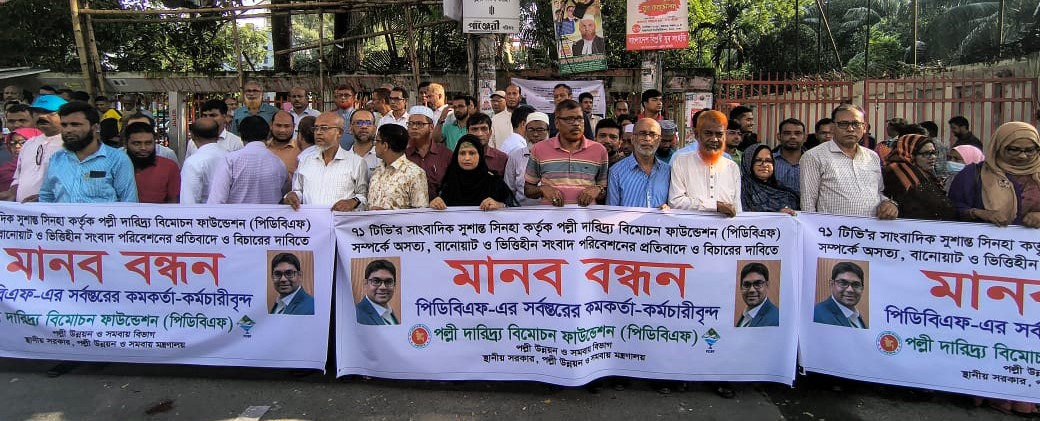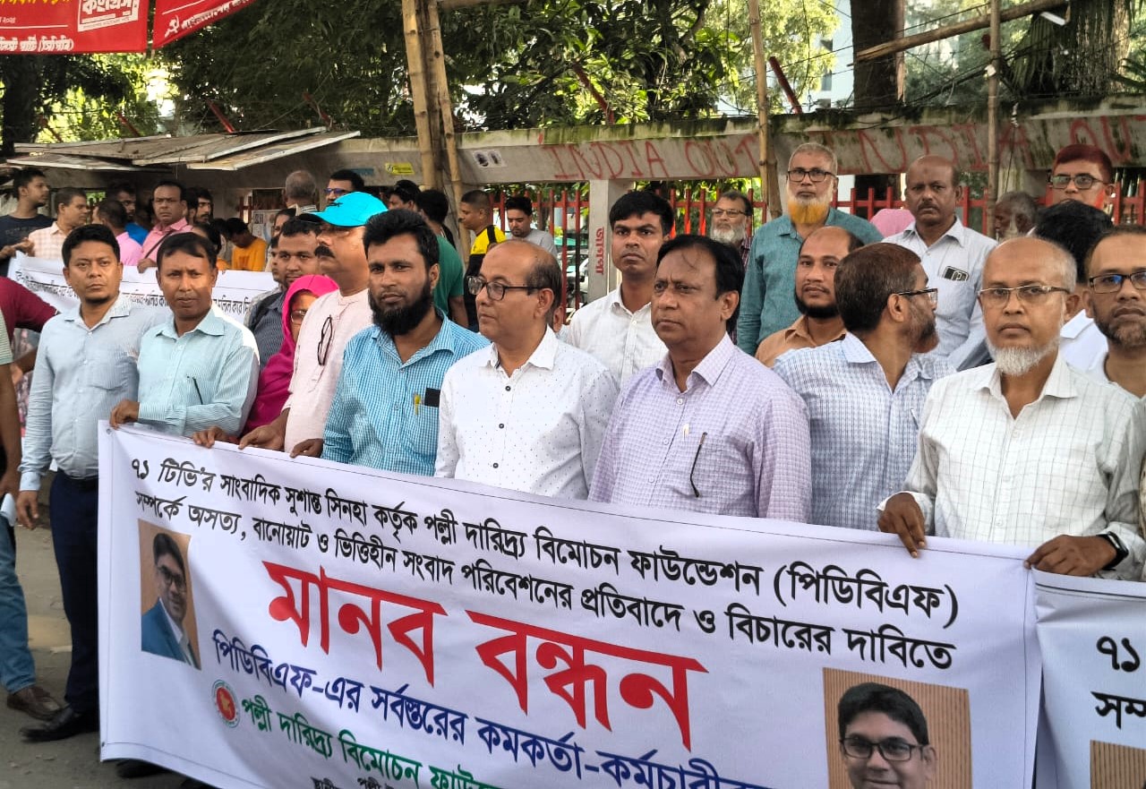 পিডিবিএফ সম্পর্কে সাংবাদিক সুশান্ত কুমার সিনহা কর্তৃক অসত্য, বানোয়াট ও ভিত্তিহীন সংবাদ পরিবেশনের প্রতিবাদে ২৭ সেপ্টেম্বর ২০২৫ তারিখ বিকাল ০৩:০০ ঘটিকায় ঢাকা রিপোর্টার্স ইউনিটিতে পিডিবিএফ-এর সর্বস্তরের কর্মকর্তা-কর্মচারীর উপস্থিতিতে সংবাদ সম্মেলন ও সংবাদ সম্মেলন শেষে প্রেস ক্লাবের সামনে মানববন্ধন অনুষ্ঠিত হয়।